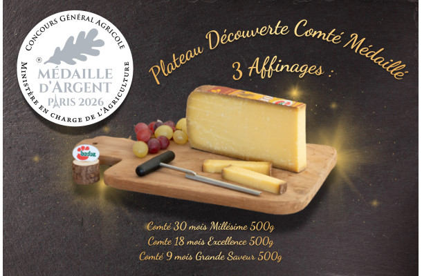 Plongez au cœur du savoir-faire jurassien avec ce plateau dédié au Comté d’exception, récompensé et affiné avec précision. Trois affinages – 9, 18 et 30 mois – pour une véritable dégustation évolutive, du plus doux au plus intense.